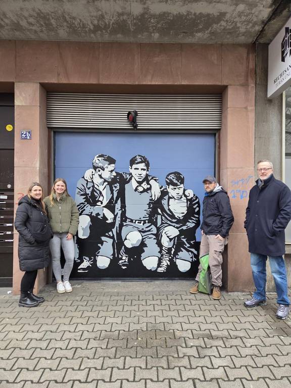 Im Rahmen des Internationalen Holocaust-Gedenkens setzte das Fanprojekt Mannheim mit Unterstützung des MARCHIVUM ein sichtbares Zeichen der Erinnerung: Ein Graffiti-Wandbild erinnert seit Kurzem an Walter Blum, der 1944 im Konzentrationslager Auschwitz ermordet wurde. Da sich das Gebäude, an dem das Wandbild angebracht wurde, im Besitz der Evangelischen Kirche befindet, wandte sich Tilo Dornbusch vom Fanprojekt im Vorfeld der Aktion an die Evangelische Kirche und ihre Diakonie. Dort stieß das Vorhaben auf offene Unterstützung. So konnte das Garagentor des Hauses als Ort des Erinnerns genutzt werden – ein sichtbares Zeichen dafür, dass historische Verantwortung und heutiges Engagement Hand in Hand gehen. „Die Aktion zeigt, wie wichtig es ist, historische Themen mit jugendlichen Fans zu verbinden“, sagt Martin Metzger, stellvertretender Direktor des Diakonischen Werks Mannheim. Den Impuls für ein dauerhaftes Gedenken gab das MARCHIVUM. Walter Blum lebte zeitweise im Mannheimer Quadrat R3. Sein letzter Wohnort befand sich im Quadrat F5. Das künstlerische Denkzeichen wurde im Bereich seines früheren Lebensumfelds umgesetzt.